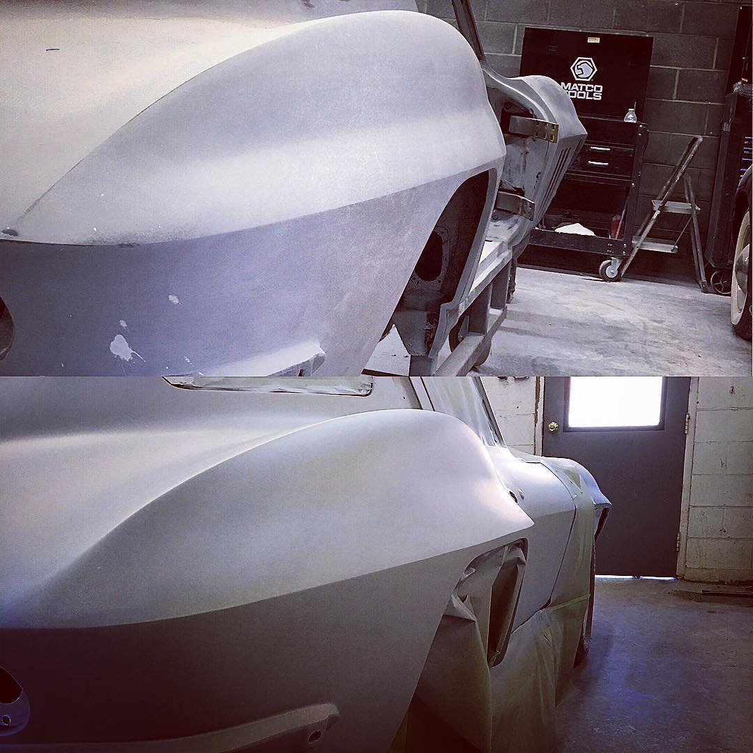 In our shop, we consider bodywork starting when the body of the vehicle is sheet metal ready (all rust, if any, has been repaired). Whether there is or is not a significant amount of body work to be performed on the body of the vehicle; after the bodywork has been finished, the entire vehicle will be sprayed with several coats of primer. Then all the primer surfaces will be block sanded by hand to eliminate any waves, dents, dings or any imperfections on the body that can and will be seen after the vehicle is painted.